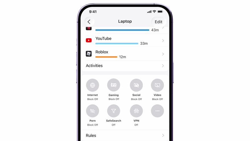 Monitor activity in real time and block games, videos, and risky sites with a single tap.