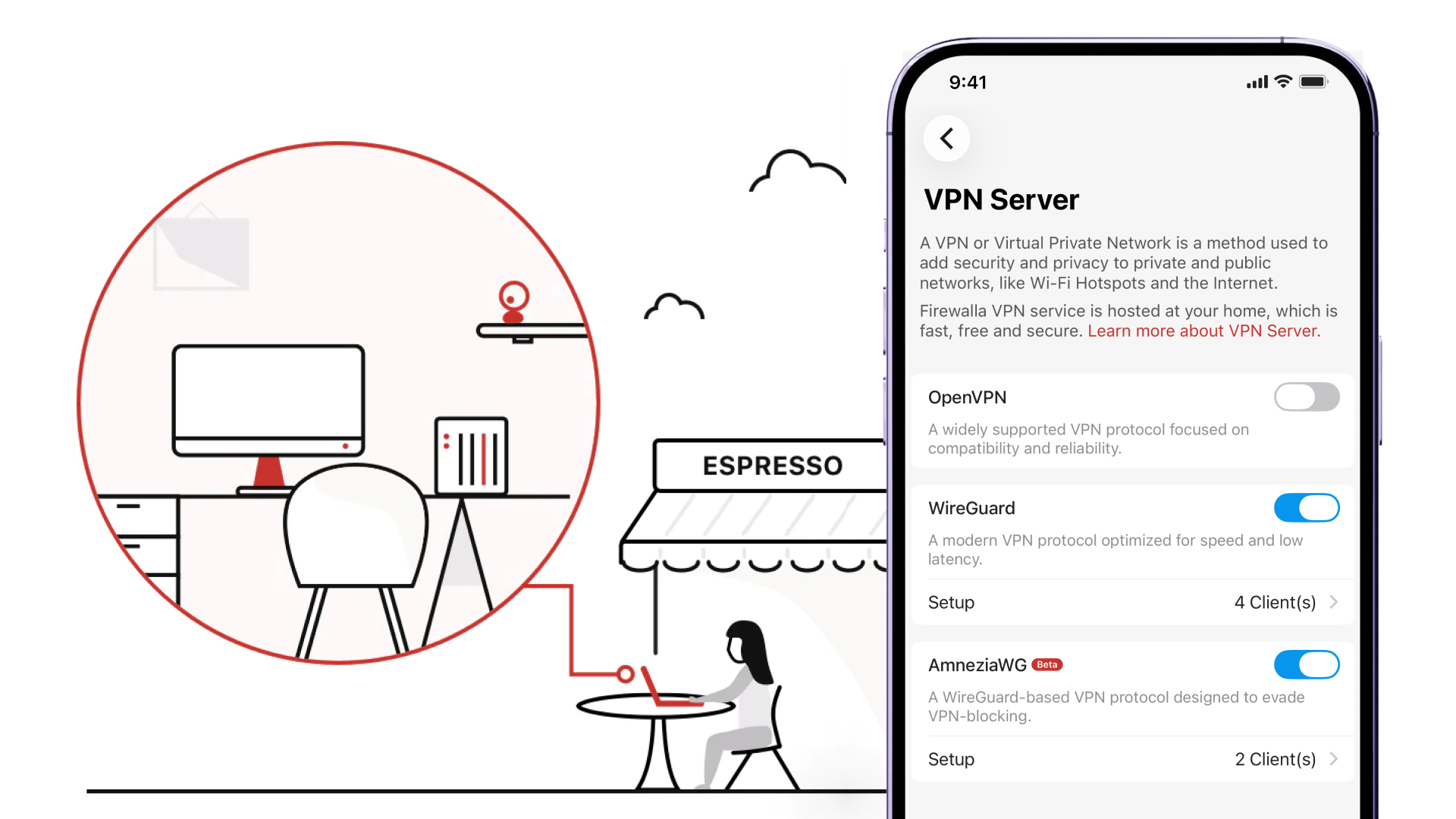 Firewalla protects your privacy on the road, in coffee shops, or on any public Wifi with our built-in VPN server! It's completely FREE, with no monthly fee.