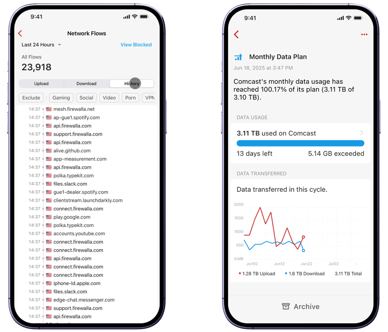 Worried about Internet usage limits or network performance issues? Firewalla Deep Insight provides a summary of hourly, daily, or monthly usage, allowing you to dig deep into any device and see the IP or domain address consuming bandwidth and stop it.